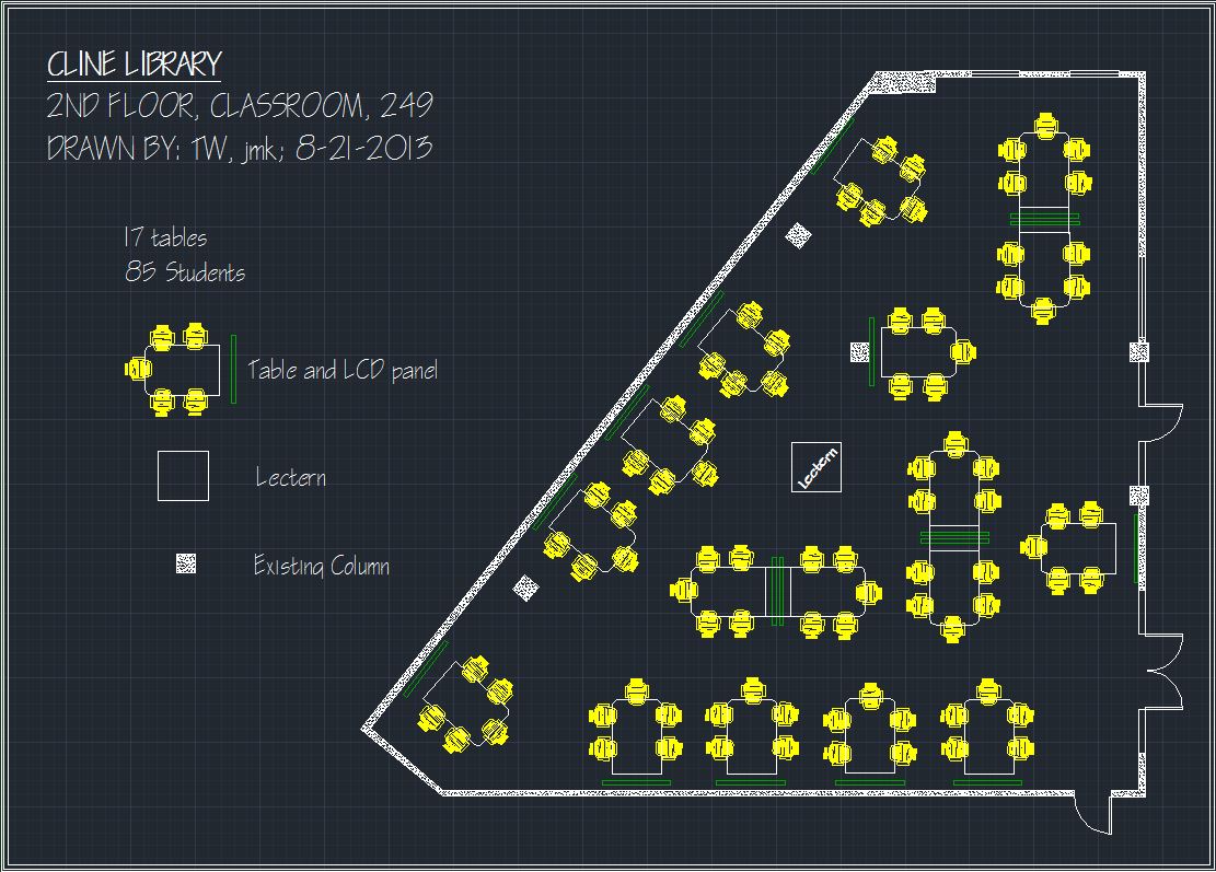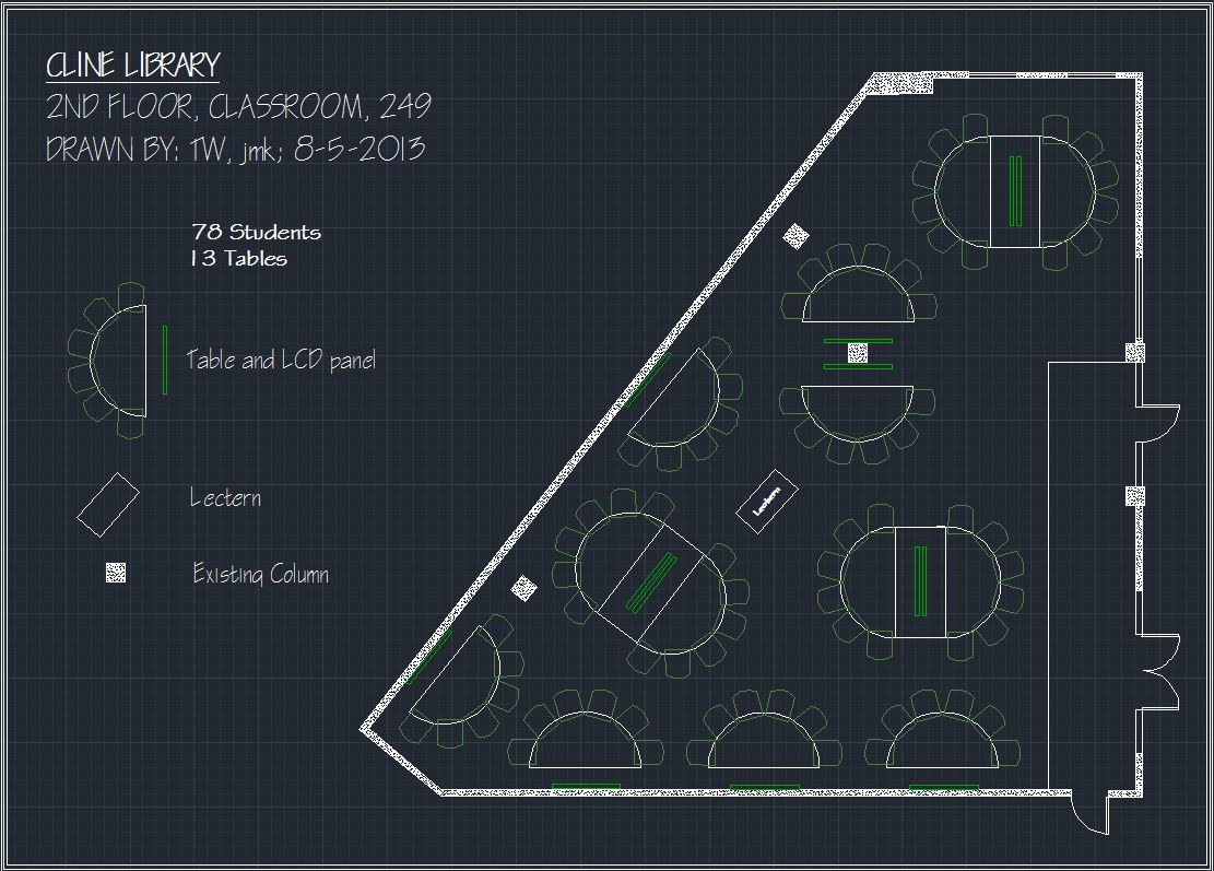 Fall, 2014 Outcome: The library decided to go with a subfloor networking and power approach, with SCALE-UP style fixed furniture, and with a sophisticated A/V switching system. A layout of the room is shown below. The final cost of the 70-seat room was about $1 million. A report on the effectiveness of the room has been prepared by NAU Assessment Office staff.