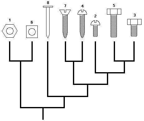 A key is useful when you find an organism and you want to identify it based on its characteristics. Here is a key based on the tree for the nuts and bolts. Start at Question 1a and read the description. If the answer to 1a is "Yes", you would be sent to Question 2a. If the answer to Question 1a is "No", you go to Question 1b, which then sends you to Question 3. Keep following the directions until you know the species by its identifying number.